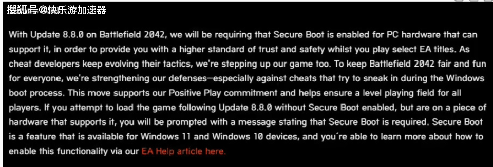 跟着 EA 将沉心转向《疆场 6》开辟,《疆场2042》于近期推送了 8。8。0 版本更新,引入平安启动(Secure Boot)强制验证机制。按照申明,玩家需正在支撑该功能的设备上启用平安启动方可运转逛戏。